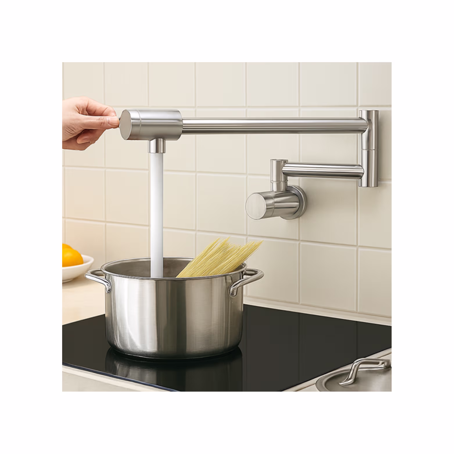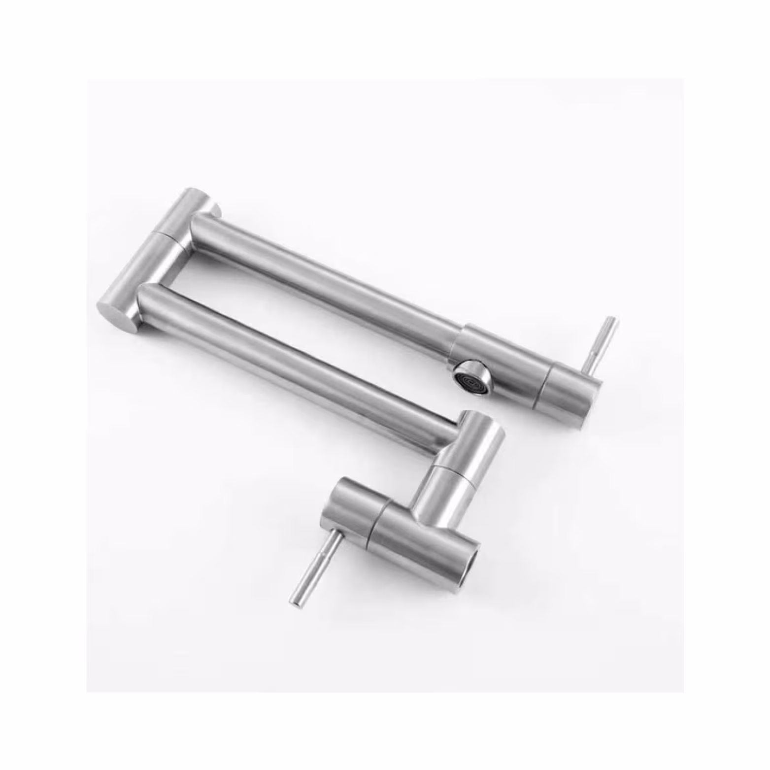 The Newmatic Pot Filler Kitchen Tap is a sleek, wall-mounted faucet that will add style and convenience to your kitchen. This double-jointed tap, which is made of high-quality stainless steel with a brushed finish, extends smoothly over your cooktop so you can fill pots directly without having to lift or carry them. When not in use, the swivel arms neatly fold against the wall, and its dual-handle design provides precise control. It blends everyday functionality with industrial elegance, making it perfect for contemporary kitchens.